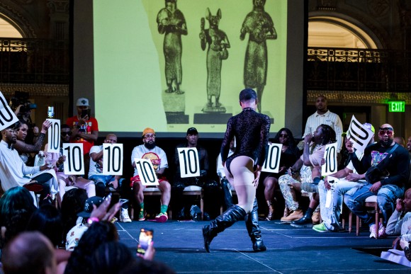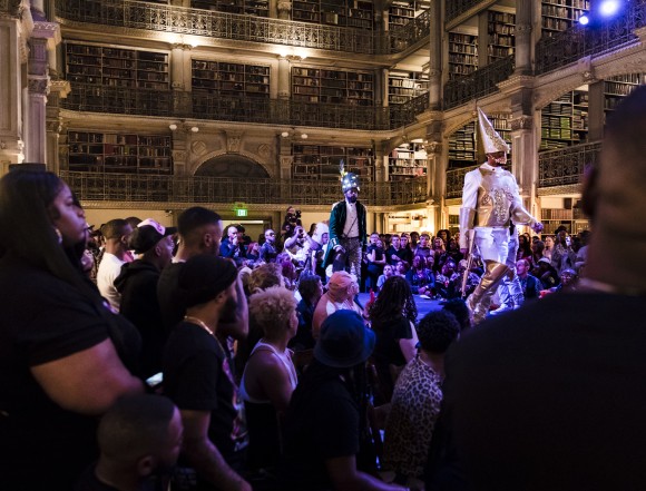 For over three hours, performers embodied the Legends and Icons who paved the way for those gathered in the Library. For the category “Femme Queen Perfect 10,” for example, trans women competed for prizes in a category Rhonda Carr titled “Cleopatra” in honor of Baltimore ballroom legend Sabrina Icon: “a queen much like Cleopatra.” In instructions circulated before the ball, Carr asked performers to “compel the judges” by “embodying” both Cleopatra and Sabrina Icon. As they competed, vintage YouTube videos of Sabrina Icon played on a screen behind the runway while the event commentators recounted her contributions and past performances, often chanting in sync with the DJ’s signature beats. Another category, written by Enrique St. Laurent, required dancers to perform in the style of Baltimore legend Ricky Allure, embodying his “grace, antics and clever stunts.” They were required to dress “as a mystical fairy,” inspired by the Peabody Library’s copy of Michael Drayton’s Nymphidia: the Court of Fairy (1814). Every moment was referential, as performers embodied historical figures and fashion, putting modern takes on everything from the “Blood of our Ancestors” to the “Amazons.” From the categories to the costumes to the rare books that lined the stacks, history suffused the event.