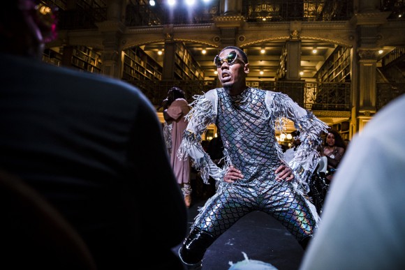 Icon Marquis Clanton and Peabody BFA Dance students perform at the April 15 "Baltimore Beautiful Symbols" ball at the George Peabody Library. Image courtesy of Saskia Kahn.