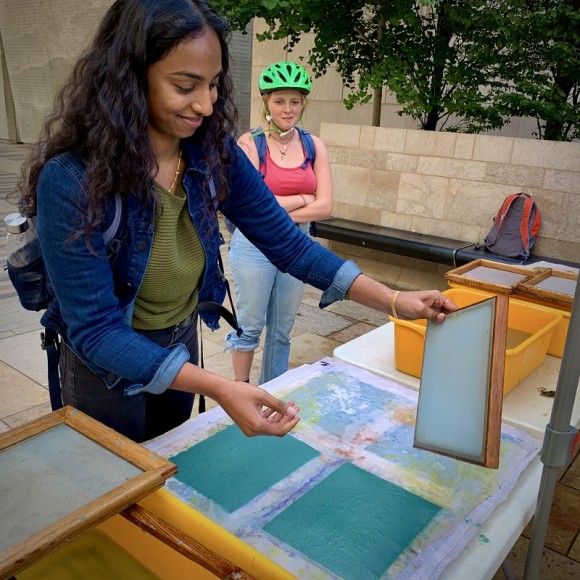 Paper artist/community collaborator Robert Possehl (right center) and "HH Student Curators" admire the artistry of one participant’s handmade paper (left center). Photo courtesy of Joshua Calhoun.