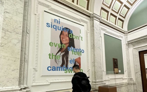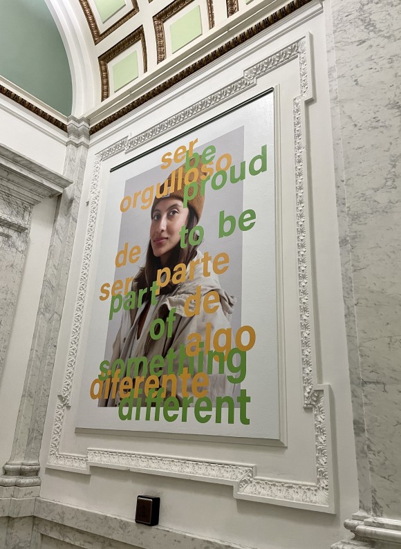 The design of the exhibit, created by Professor Chantal Fischzang and her students in the Arts, Culture, and Media department at RU-N, centers on the concept of “language layers,” which involves text clouds that are formatted to hover within the framing of a background image, photo, or environment. The narrative is based on excerpts of insights on bilingualism from the interview recordings, and they are presented in two colors to address translations. Text is layered over photographs, captured by Professor Anthony Alvarez's photography students in the Arts, Culture, and Media department at RU-N at SHINE Portrait Studio, of LiT students conducting interviews, shown as quotes in two languages.