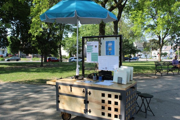 C21 Summer Fellow Jamee Pritchard interviews Alex Hanesakda at the Mobile Story Cart during the Milwaukee Southside Organizing Center Garden Fest. A Nourishing Trust poster from C21's 2022–2023 programming is included with other materials on the back panel of the cart. Image courtesy of Yuchen Zhao.