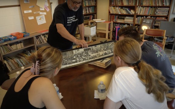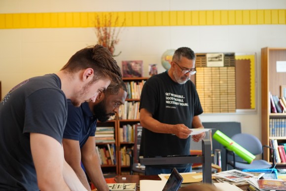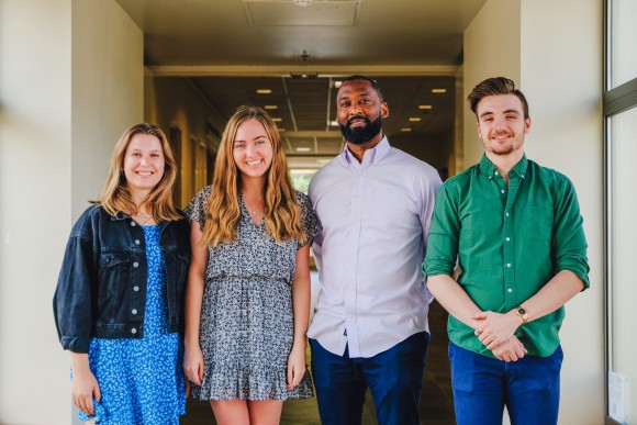 BCAP team meeting. Left to right: Monica Wohlhuter, Timothy Rainey II, Kaitlin Moe, and Noah Lafferty. Image courtesy of Steven Garcia, St. Olaf College photographer.