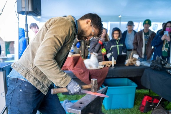 First, the Institute has partnered with regional artisans and educators to bring their practice of historically informed crafts to the university. We invited these community partners to campus on football Saturdays to share their expertise with students, faculty, alumni and visitors, including families with young children. They demonstrated their hands-on experience with crafts that date back thousands of years: cooking, martial arts, falcon hunting, metal forging, and cosmological modeling. These experiential learning activities productively complement the academic research of our faculty on campus and enhance student learning about medieval art, science and technology. These events not only raised the Institute’s visibility; they also centered the lived experience, knowledge, and skill of medieval workers—a social class often overlooked in popular imaginings of medieval knights and ladies.
